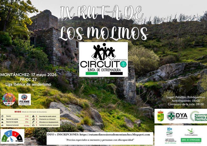 El Ayuntamiento de Montánchez en colaboración con la Mancomunidad Integral Sierra de Montánchez y el Ayuntamiento de Arroyomolinos organiza la “IX Ruta de los Molinos” perteneciente al Circuito Camina Extremadura 2026 que se celebrará el domingo 17 de mayo de 2026. El recorrido de la ruta es circular con un total de 12,4km, con salida desde el Pabellón Polideportivo de Montánchez y llegada en la Plaza de España y una duración aproximada de 4 horas.