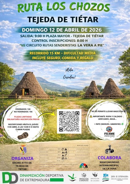 La Ruta Senderista "Los Chozos" tendrá lugar el 12 de abril de 2026 sobre una distancia de 15 km (circular) de dificultad media.