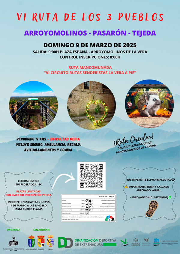 La VI Ruta de los 3 Pueblos tendrá lugar el domingo 9 de marzo de 2025 sobre una distancia de 19 km de dificultad media.