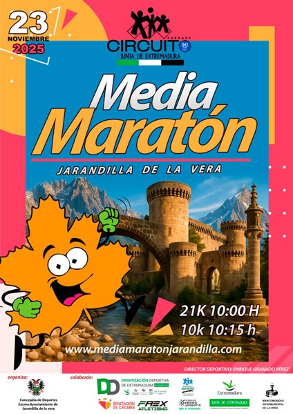 La XXVII Media Maratón organizada por el Ayuntamiento de Jarandilla de la Vera, se celebrará el 23 de noviembre de 2025 a las 10 de la mañana desde la Avda. Joaquín Ruiz Jiménez s/n junto a la Casa de la Cultura. También se celebrará la V carrera de 10 kilómetros a las 10:15.
