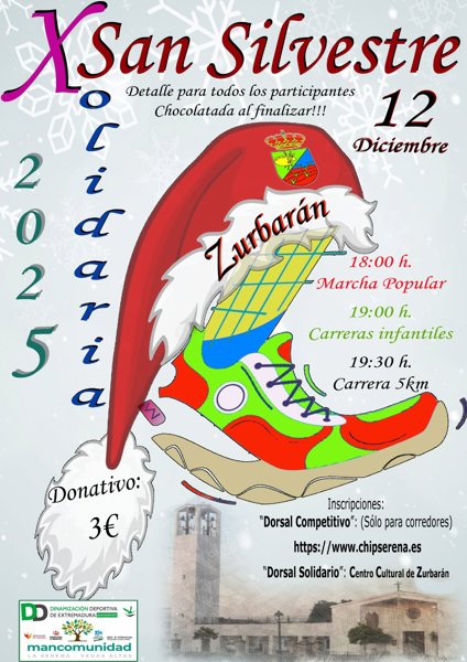 La X San Silvestre Solidaria de Zurbarán tendrá lugar viernes 12 de diciembre de 2025, con salida y meta en la plaza de Guadalupe.