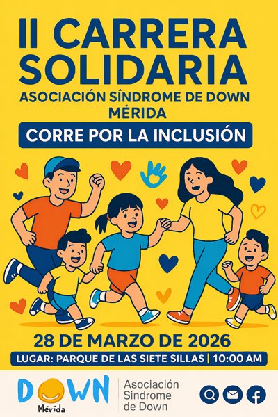 La Asociación Down Mérida organiza una carrera con carácter solidario el día 28 de marzo por la celebración del día Mundial del Síndrome de Down (21 de marzo) a partir de las 10:30h salida niños y adultos salida a las 11:30 con salida y llegada en el parque de las “Siete sillas”.