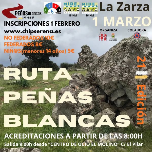 El próximo 1 de marzo se celebrará la vigésimo primera edición de la tradicional Ruta Senderista Peñas Blancas de La Zarza, una actividad ideal para disfrutar de la naturaleza y del entorno serrano de la localidad. La ruta discurre por el PR-BA 47, ofreciendo un recorrido variado y atractivo, con tramos de gran valor paisajístico. Modalidades de recorrido. Ruta principal: 18K con 580 m+. Ruta alternativa: 16 km con dificultad baja–media. Opción pensada para participantes con menor nivel técnico o físico. Servicios incluidos: desayuno, avituallamientos, obsequio, comida final y animación. La salida tendrá lugar a las 9:00h desde el centro de ocio "El Molino".