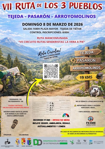 La VII Ruta de los 3 Pueblos tendrá lugar el domingo 8 de marzo de 2026 sobre una distancia de 19 km de dificultad media.