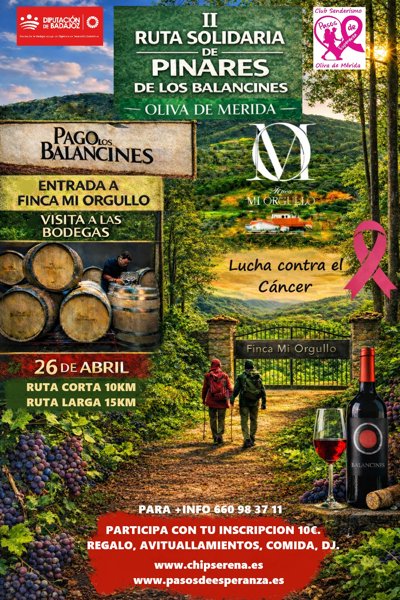 La II Ruta Solidaria Pinares de los Balancines tendrá lugar el 26 de abril a las 9:30 en Oliva de Mérida y con dos distancias a elegir: Ruta Corta (10 km) o Ruta Larga (15,5 km).
